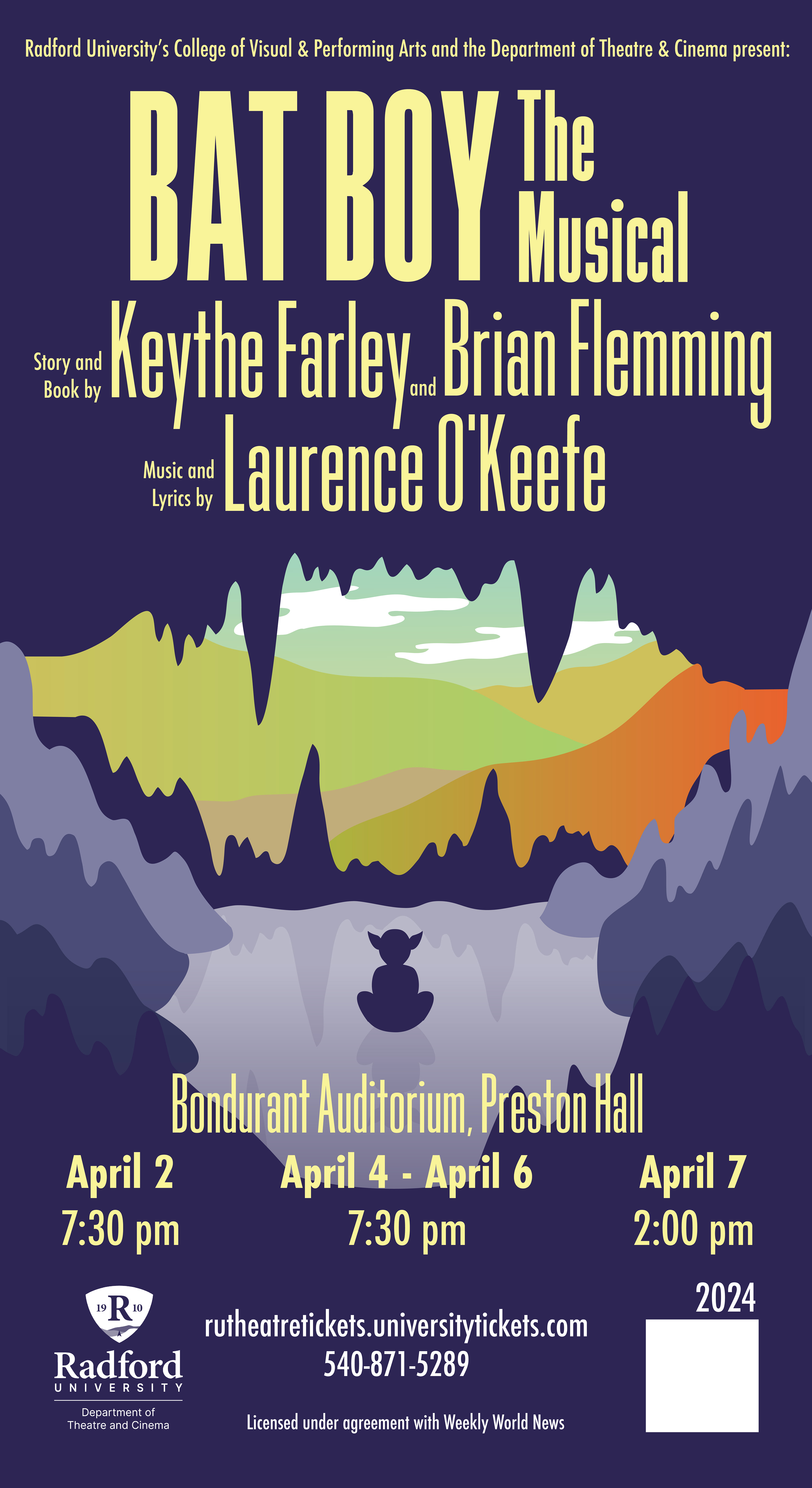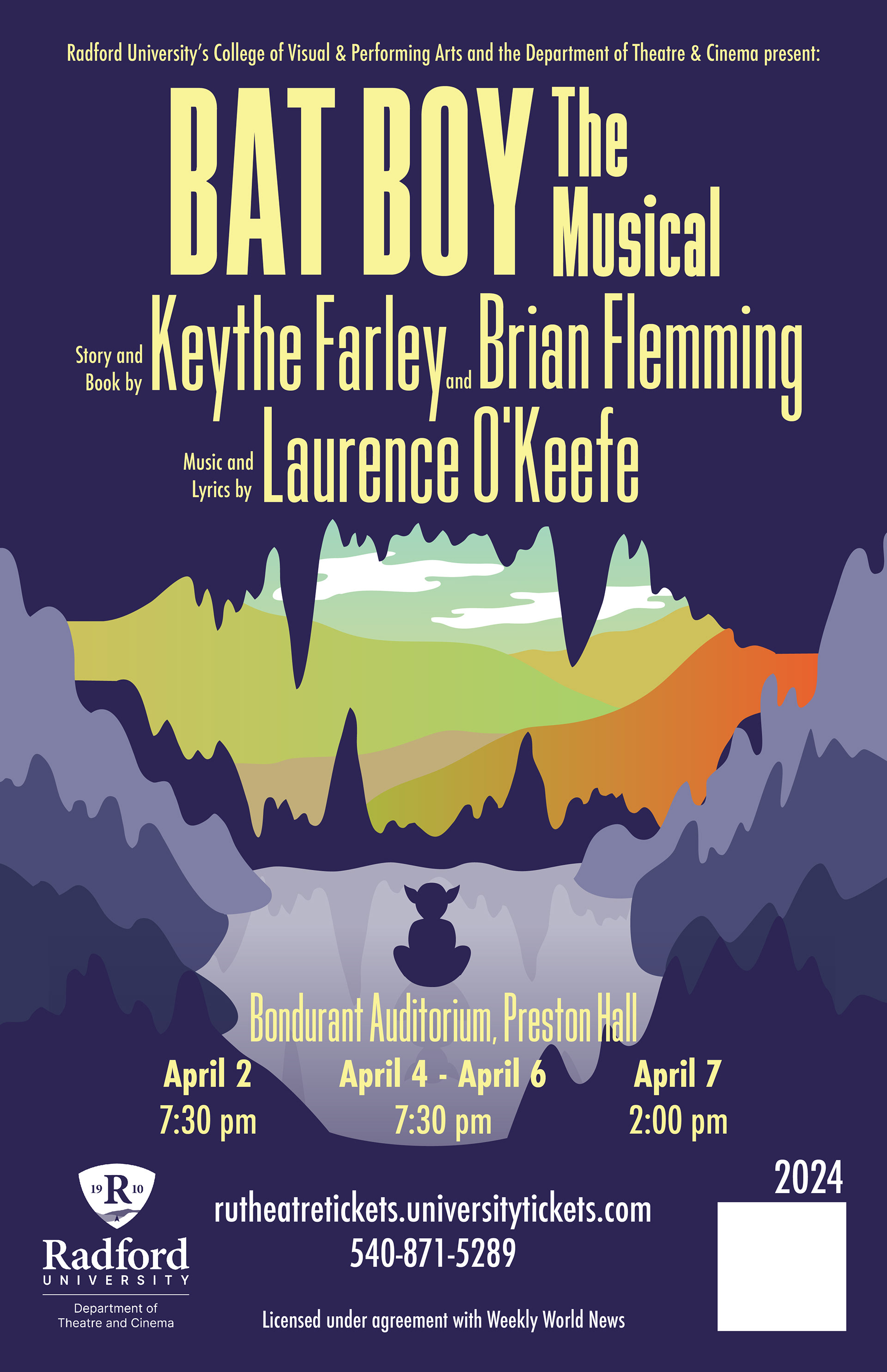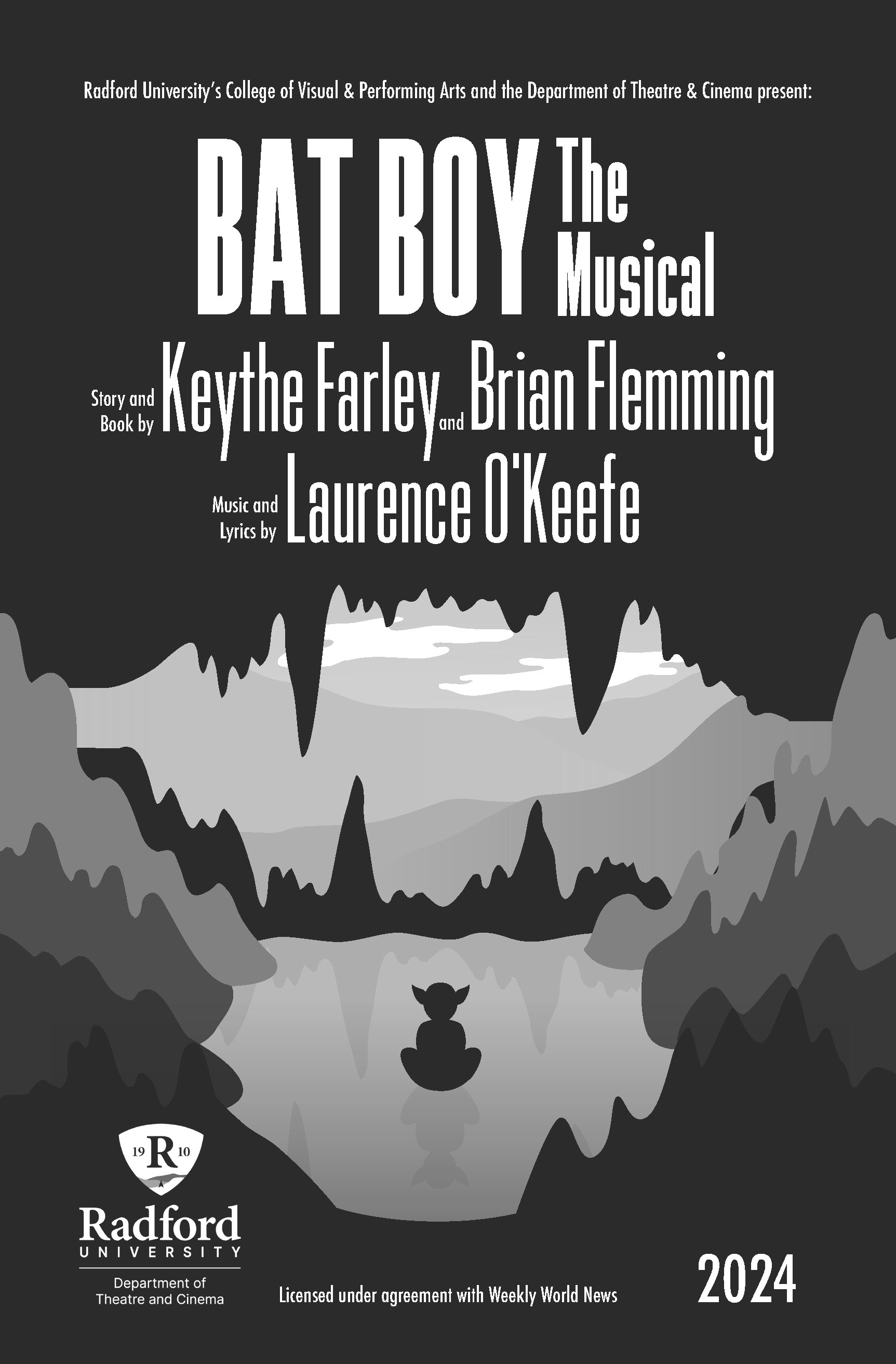 This poster was created for, and used by, the Radford University Theater Department for their play "Bat Boy the Musical." The design focused on illustrative elements that tie into themes of the story, while also keeping the style set in the time period of the play.